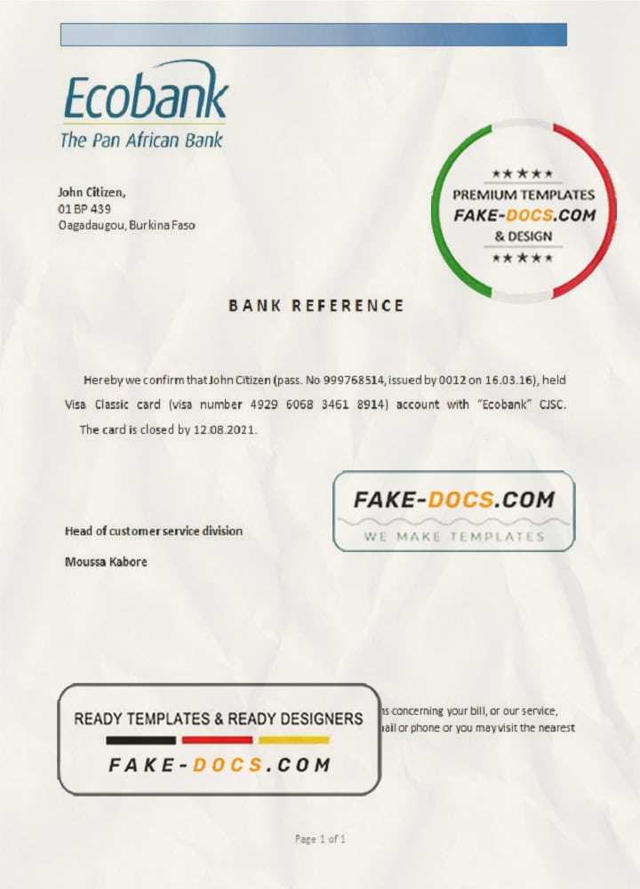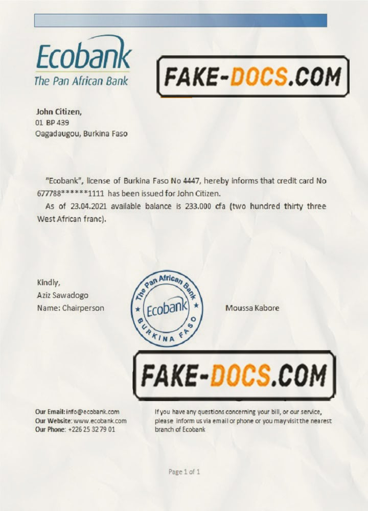 Burkina Faso Ecobank proof of address bank statement template in Word and PDF format (.doc and .pdf)
