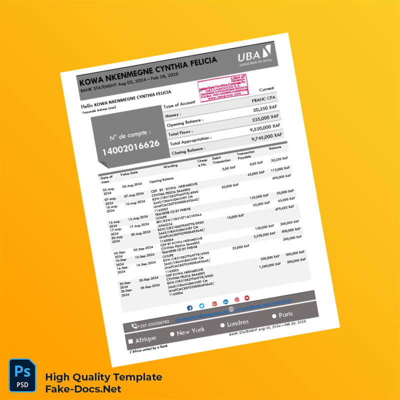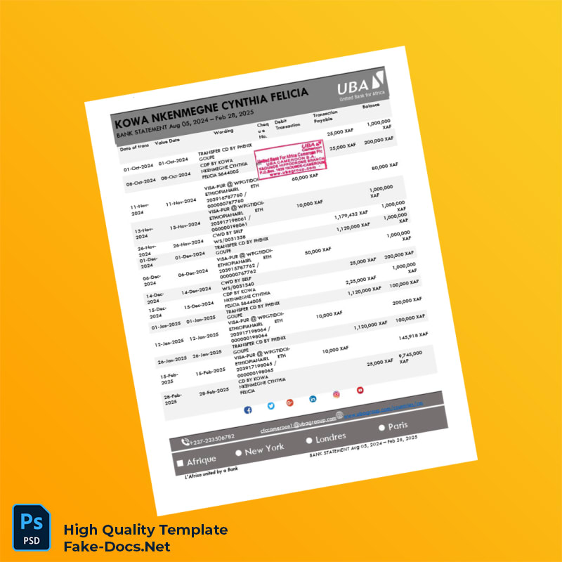 Cameroon United Bank for Africa Bank Statement Template in Word and PDF formats 3 page