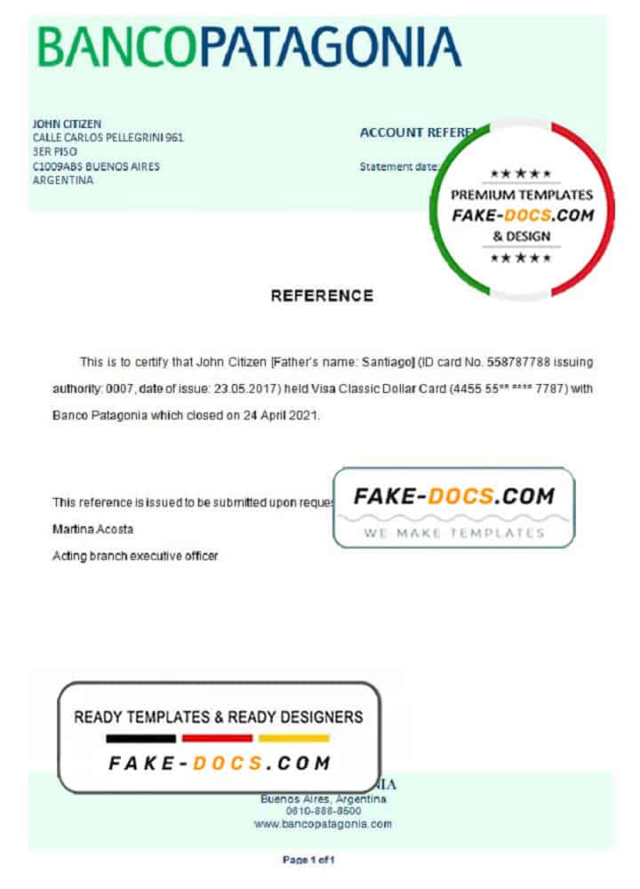 Argentina Banco Patagonia bank statement template in Word and PDF format