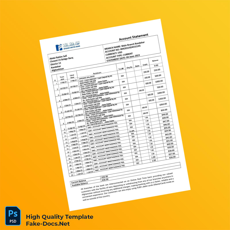 Afghanistan Afghan United Bank Statement Template in Word and PDF formats 2 page