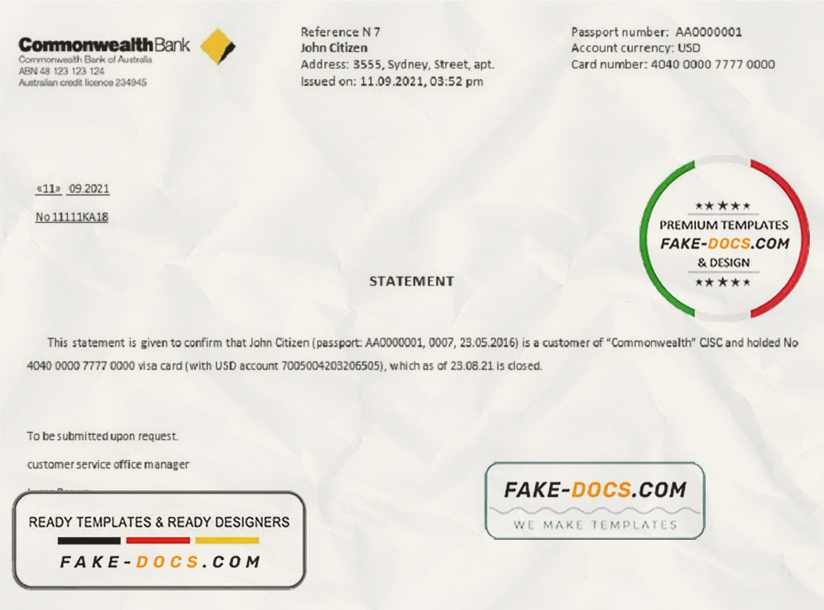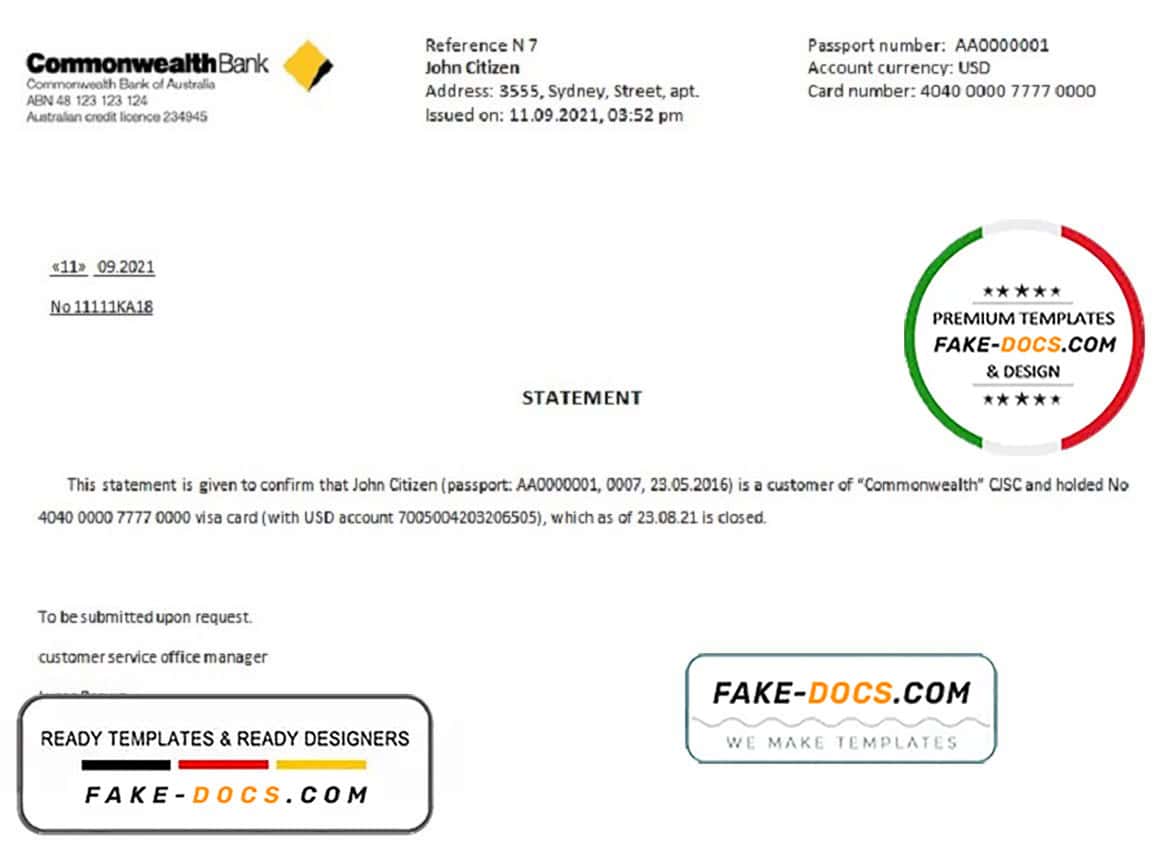 Australia Commonwealth account proof of address bank statement template in .doc and .pdf format