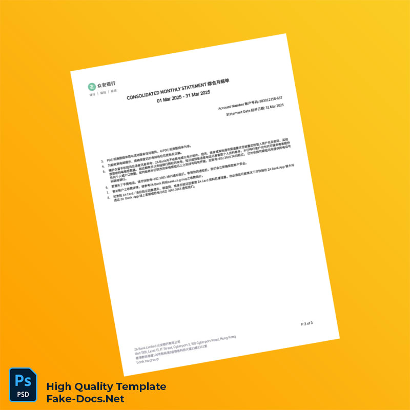 Hong Kong ZA Bank Statement Template in Word and PDF formats 3 page
