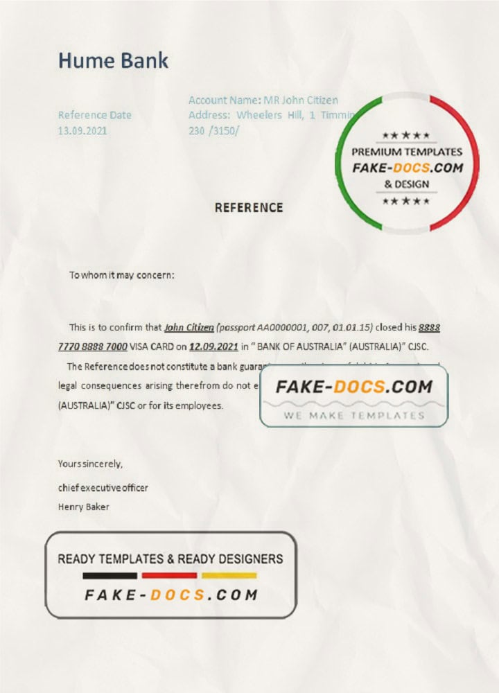 Australia Humebank proof of address statement template in .doc and .pdf format, fully editable