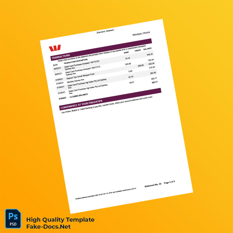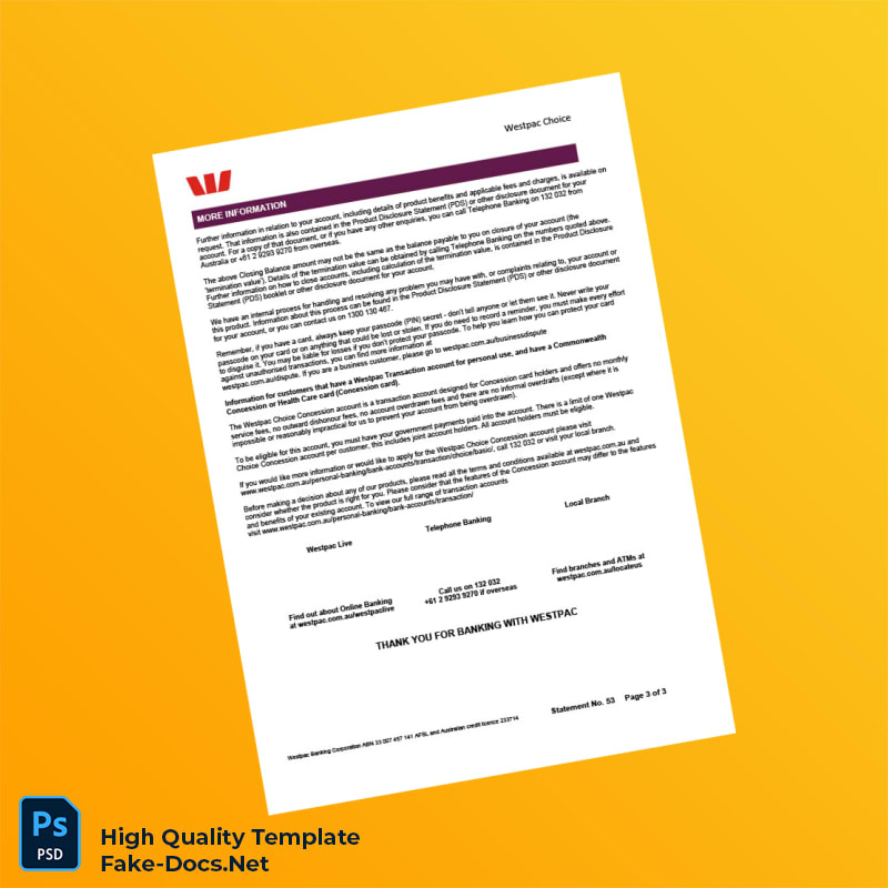 Australia Westpac Bank Statement Template in Word and PDF formats 3 page