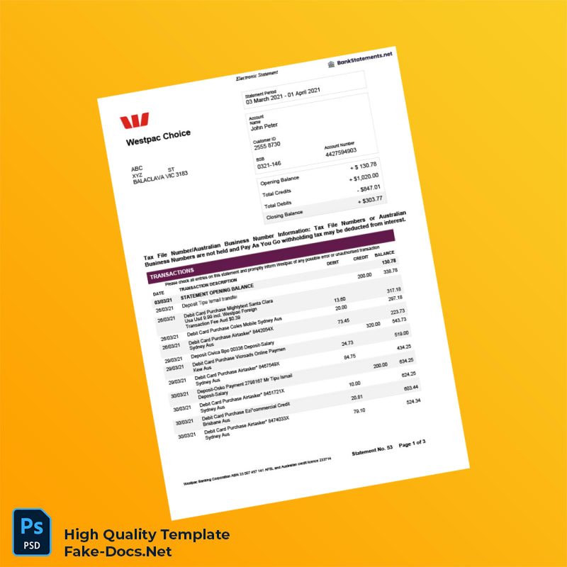 Australia Westpac bank statement Word and PDF template, 3 pages
