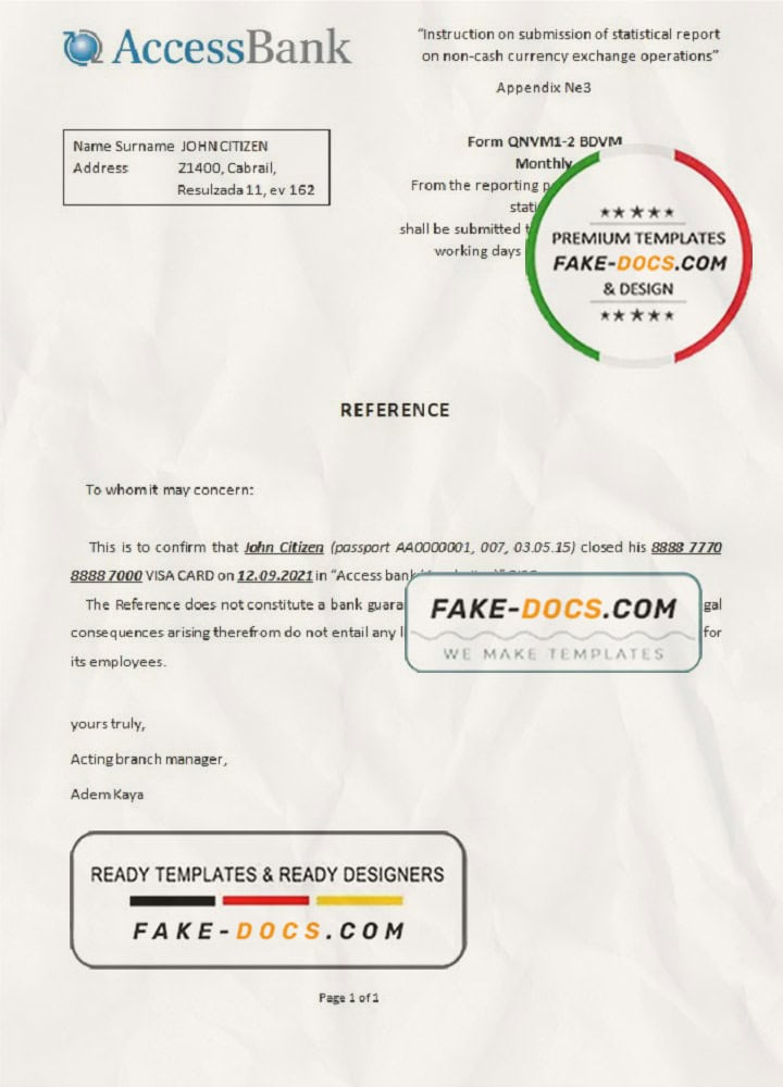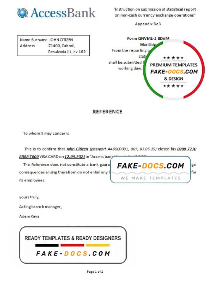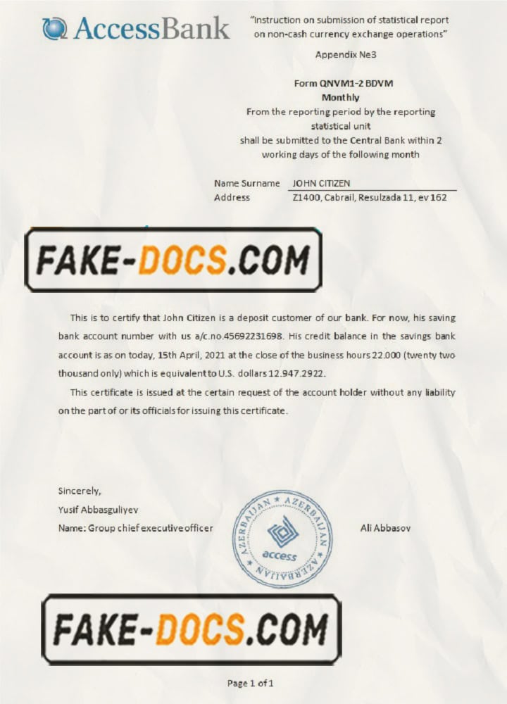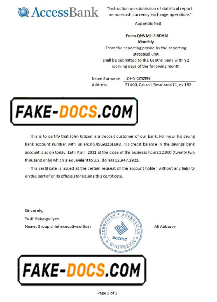 Azerbaijan Access Bank (English language) statement template in Word and PDF format