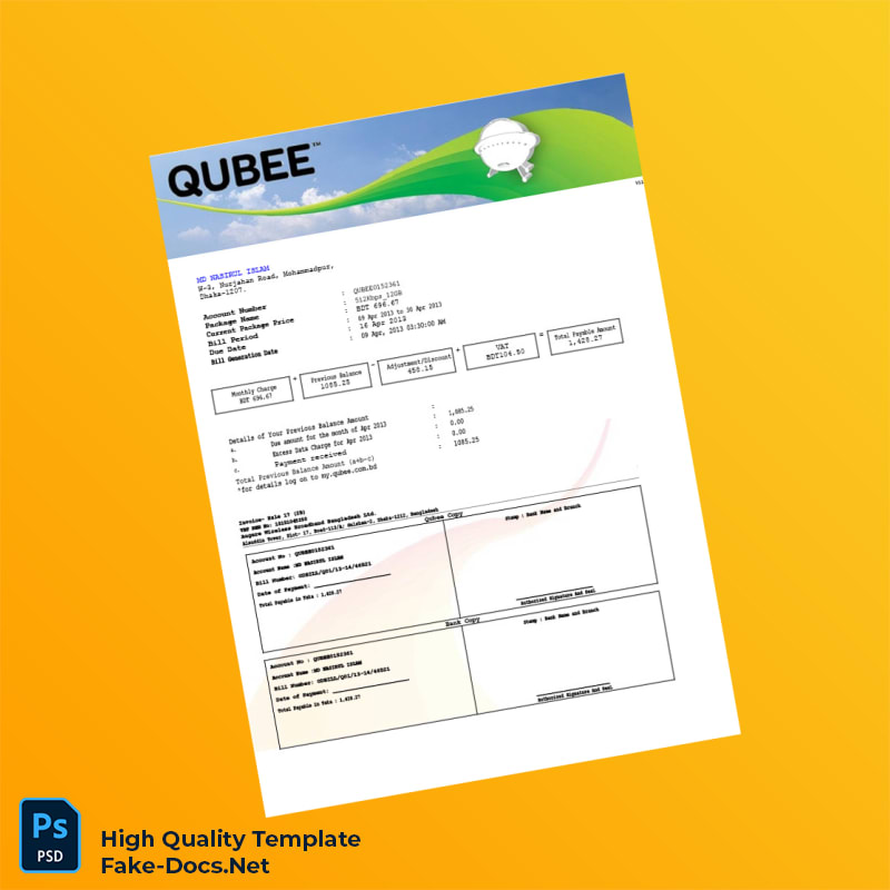 Bangladesh Qubee Editable Utility Bill Template in Word and PDF formats 2 page