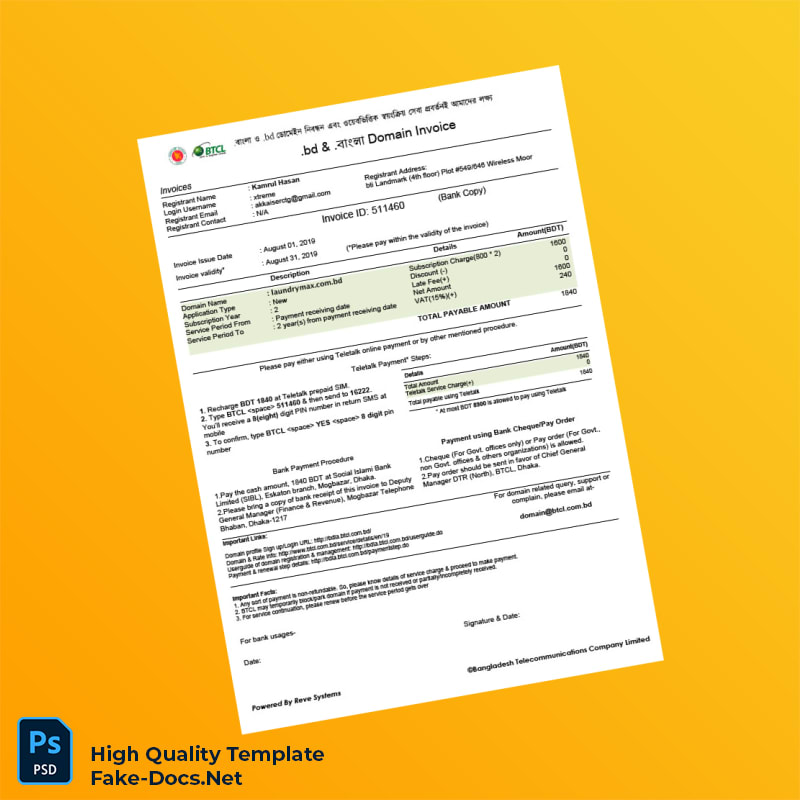 Bangladesh Bangladesh Telecommunications Company Limited Invoice Template in Word and PDF formats 3 page