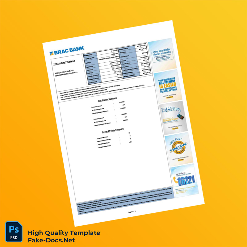 Bangladesh BRAC Bank Credit Card Statement Template in Word and PDF formats 2 page