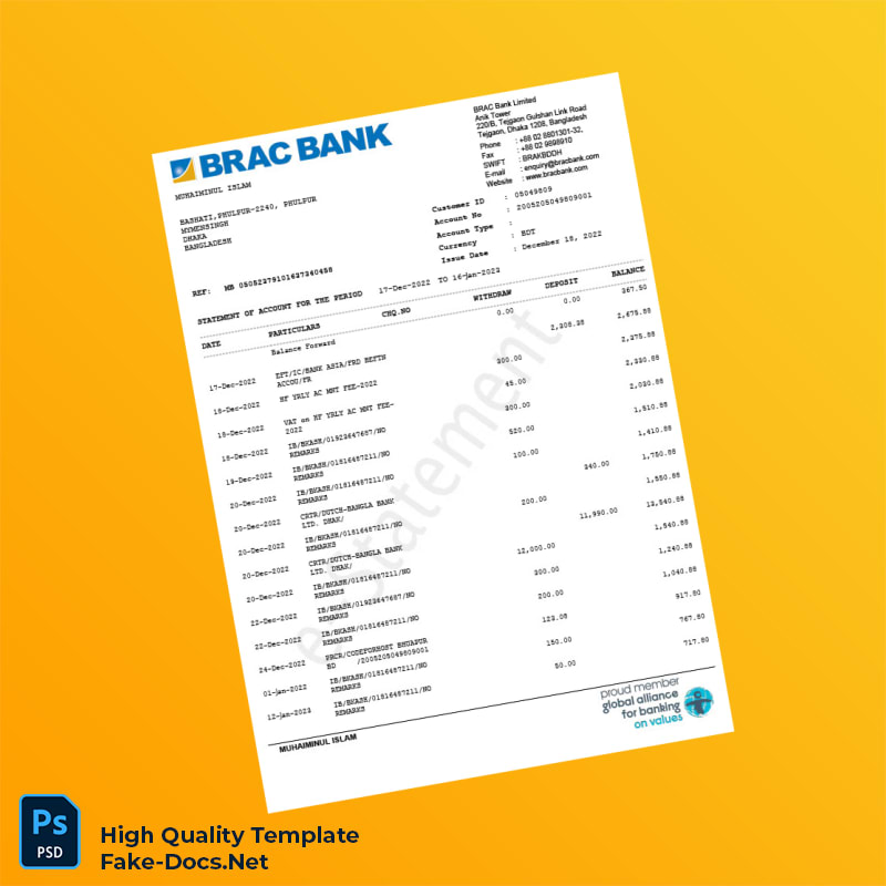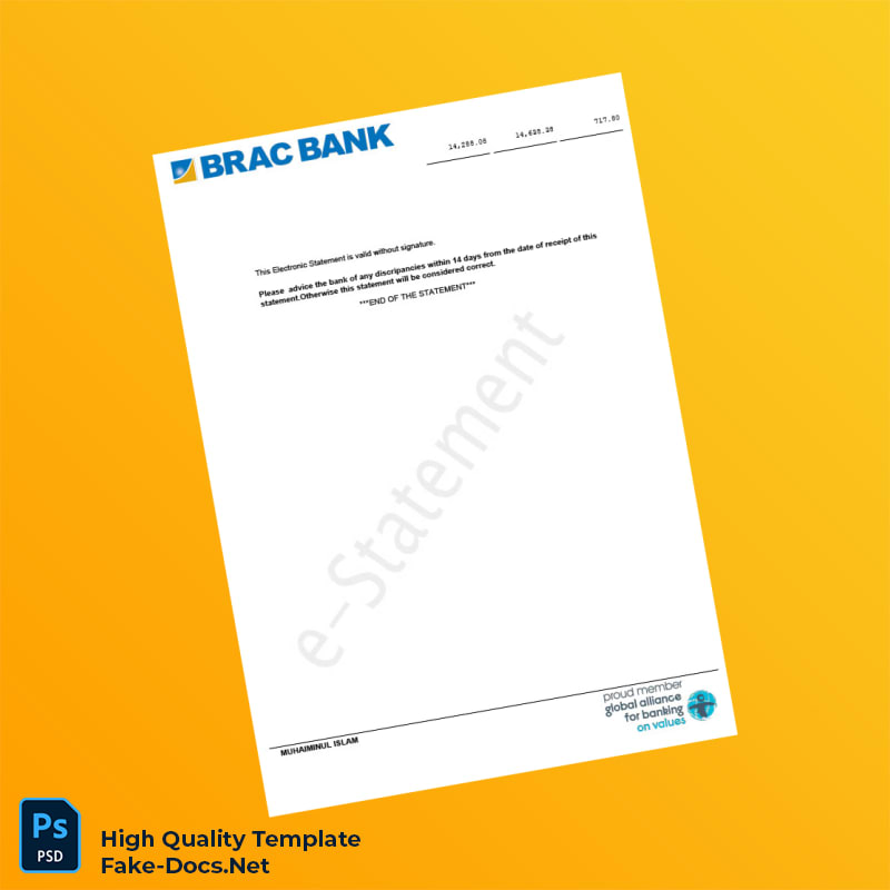 Bangladesh BRAC Bank Statement Template in Word and PDF formats 2 page