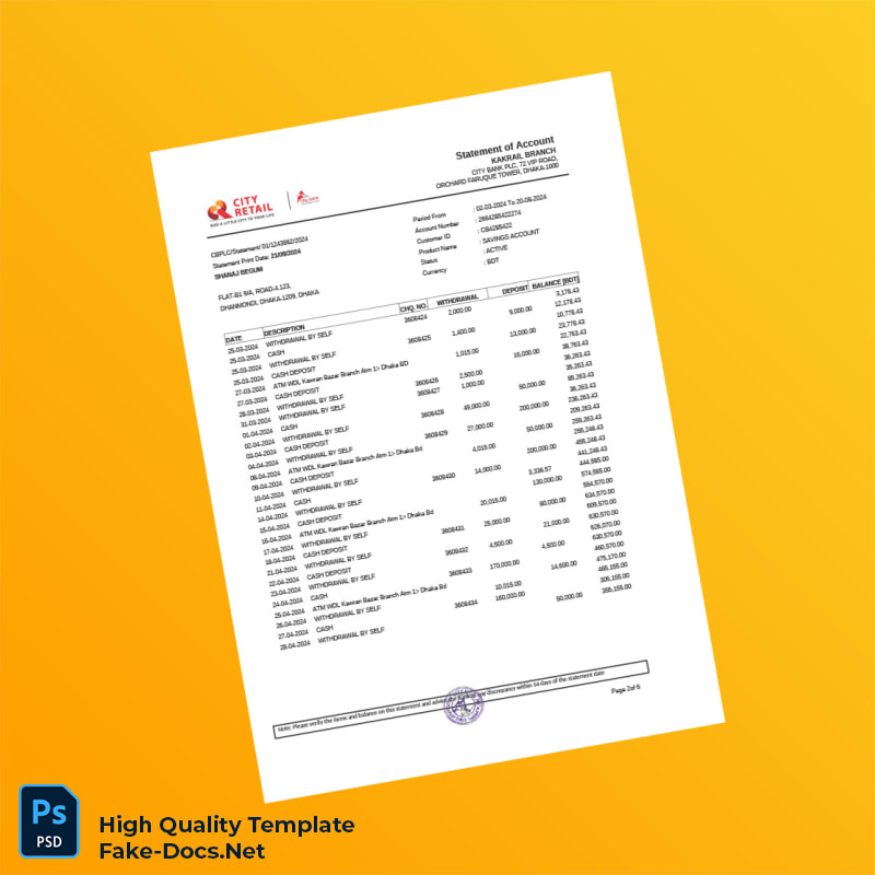 Bangladesh City Bank Account Statement Template in Word and PDF formats 2 page