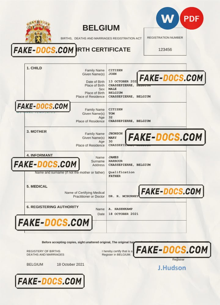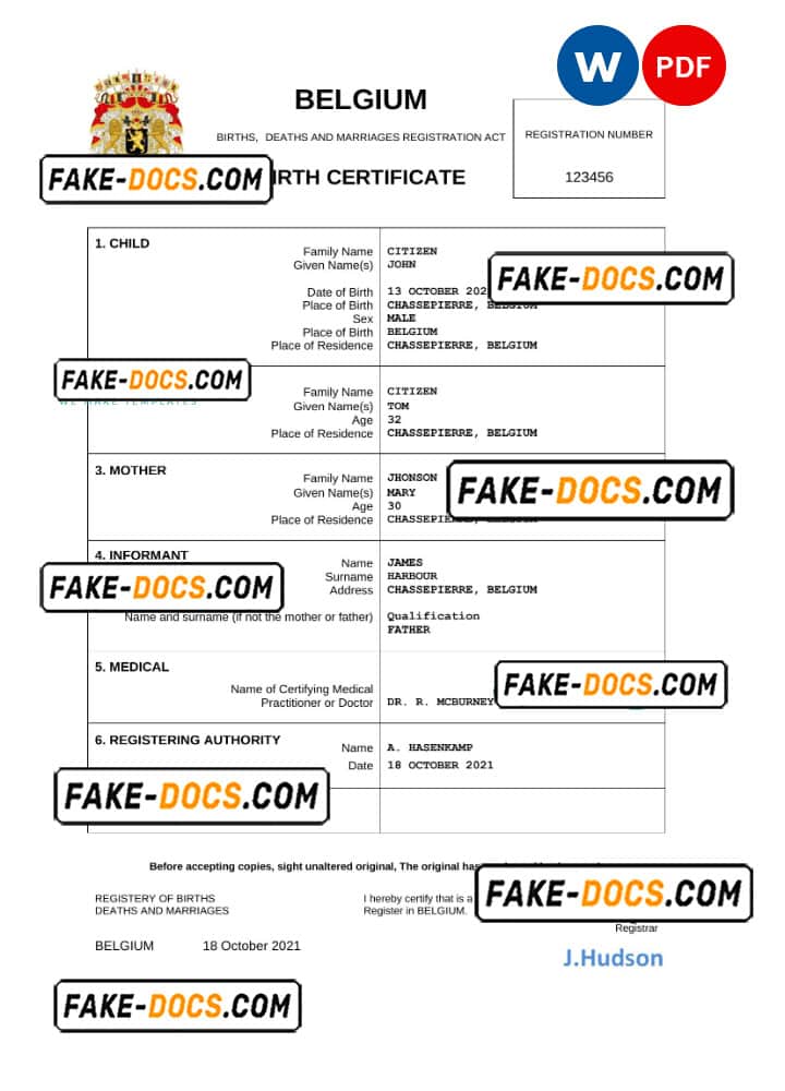 Belgium vital record birth certificate Word and PDF template
