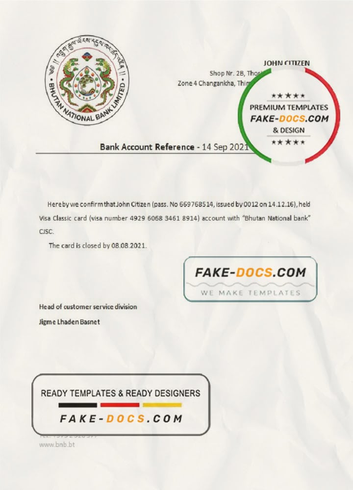 Bhutan Druk PNB bank statement template in Word and PDF format