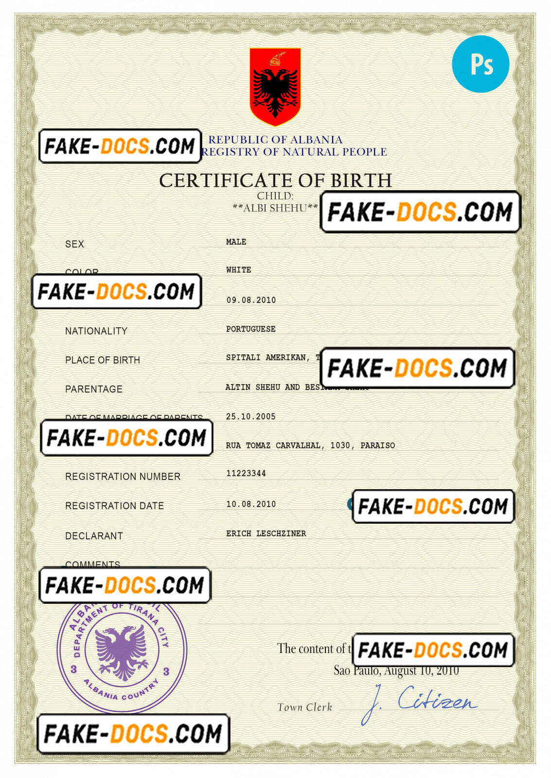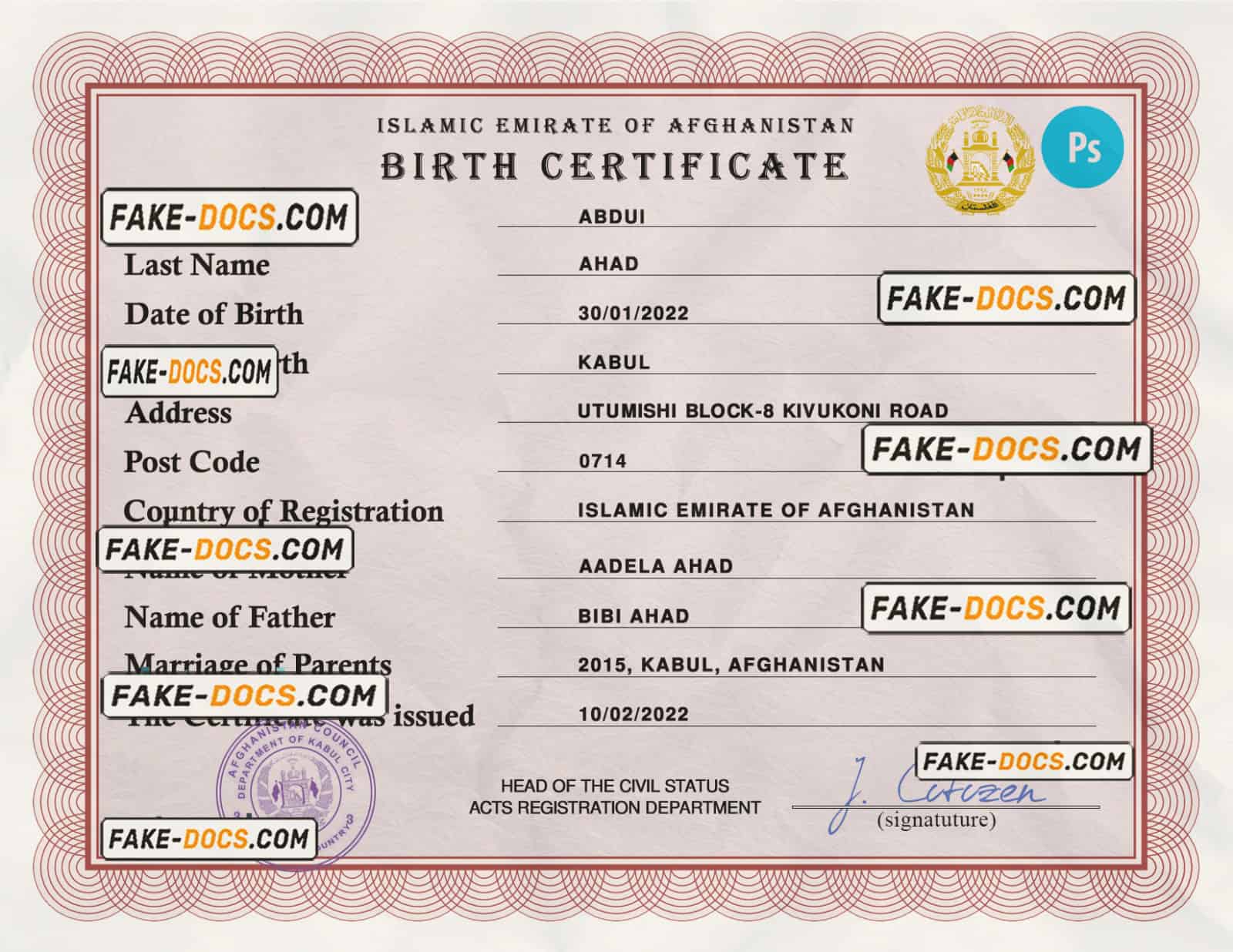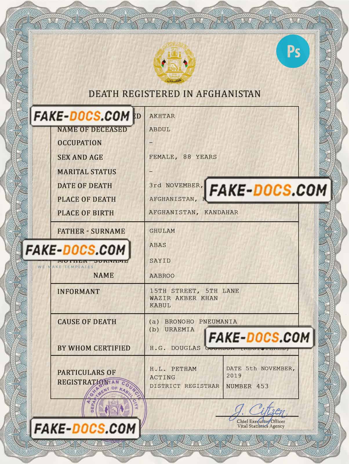 AFGHANISTAN vital record birth certificate editable PSD template, version 2