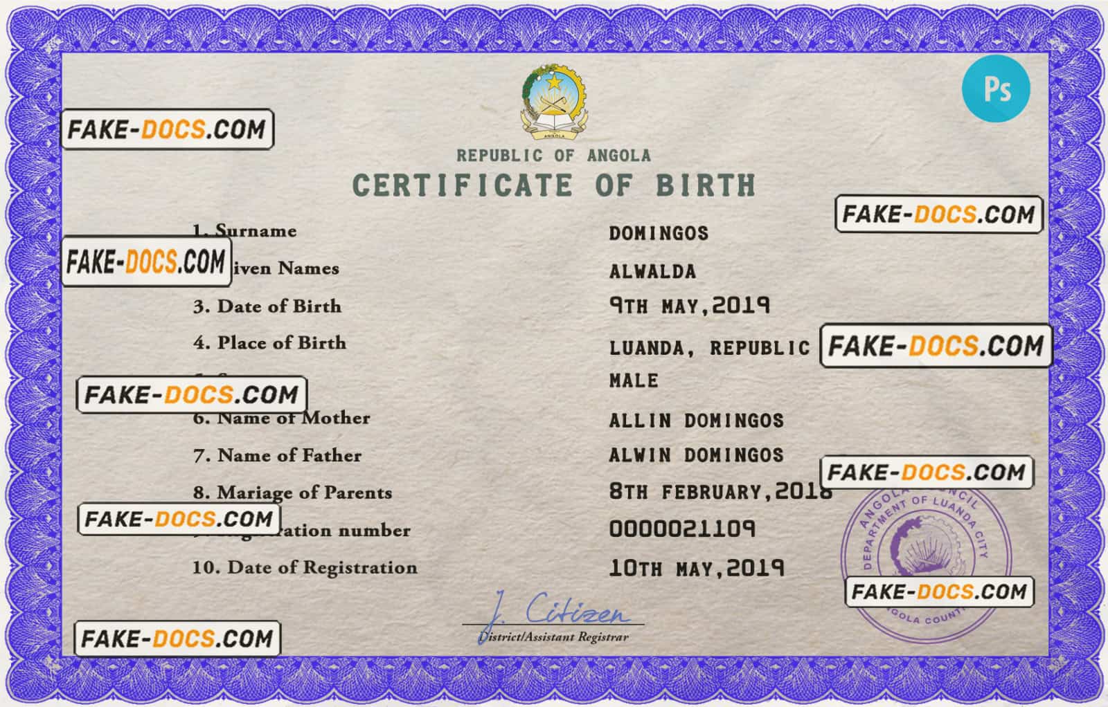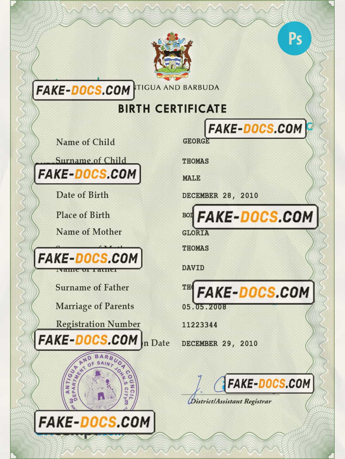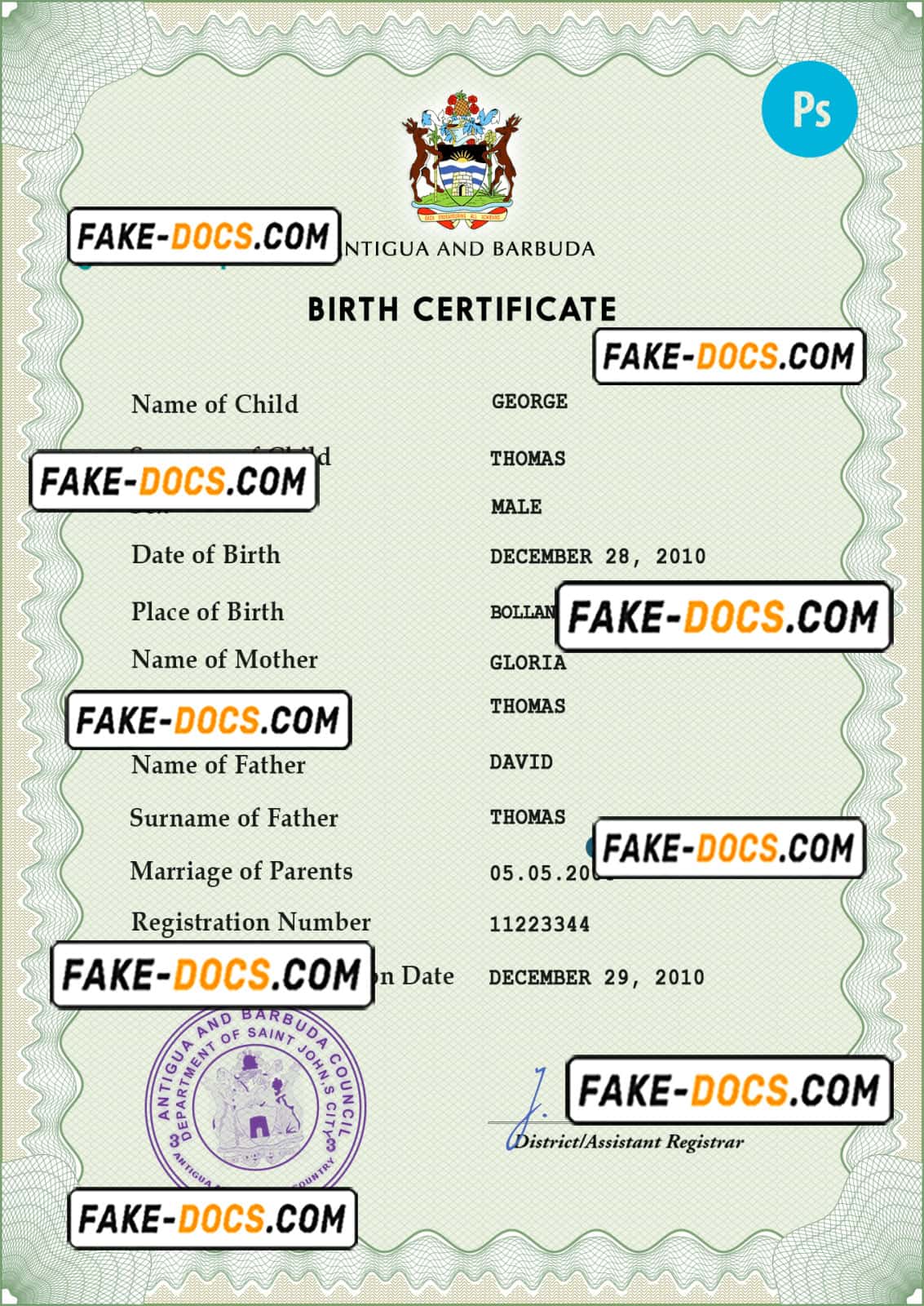Antigua and Barbuda birth certificate PSD template, completely editable