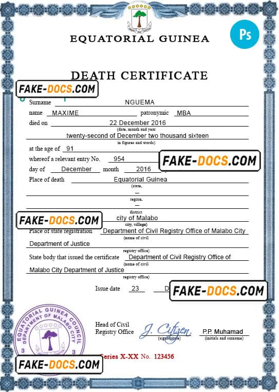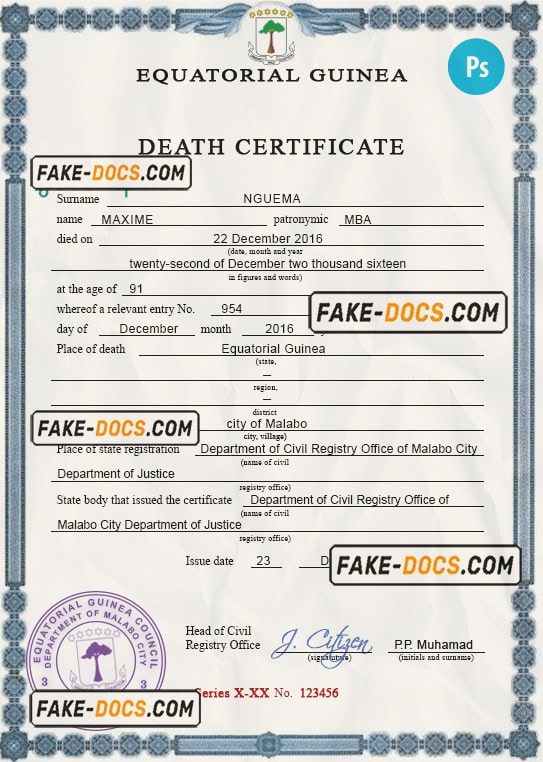 Equatorial Guinea death certificate PSD template, completely editable