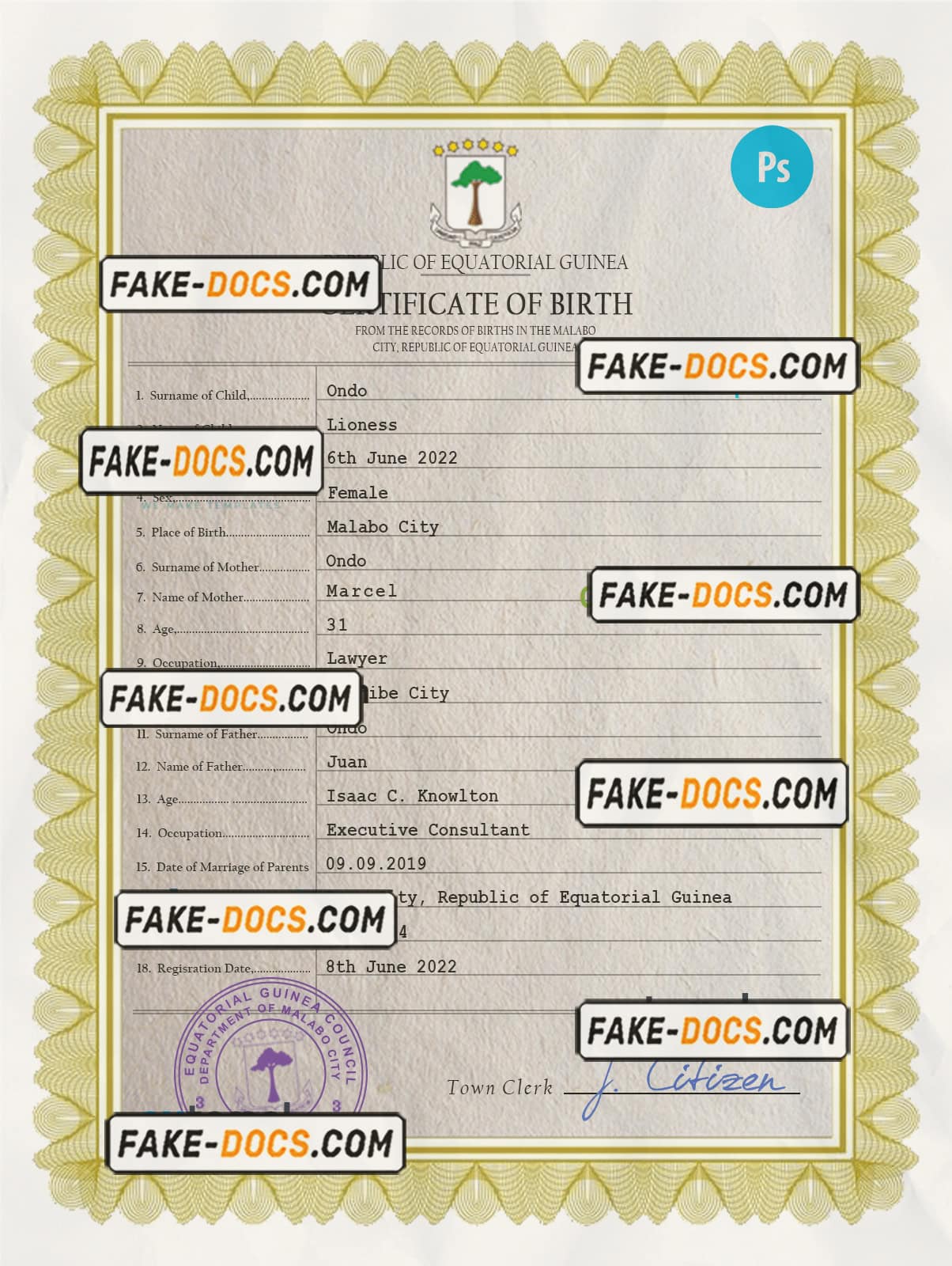 Equatorial Guinea birth certificate PSD template, completely editable