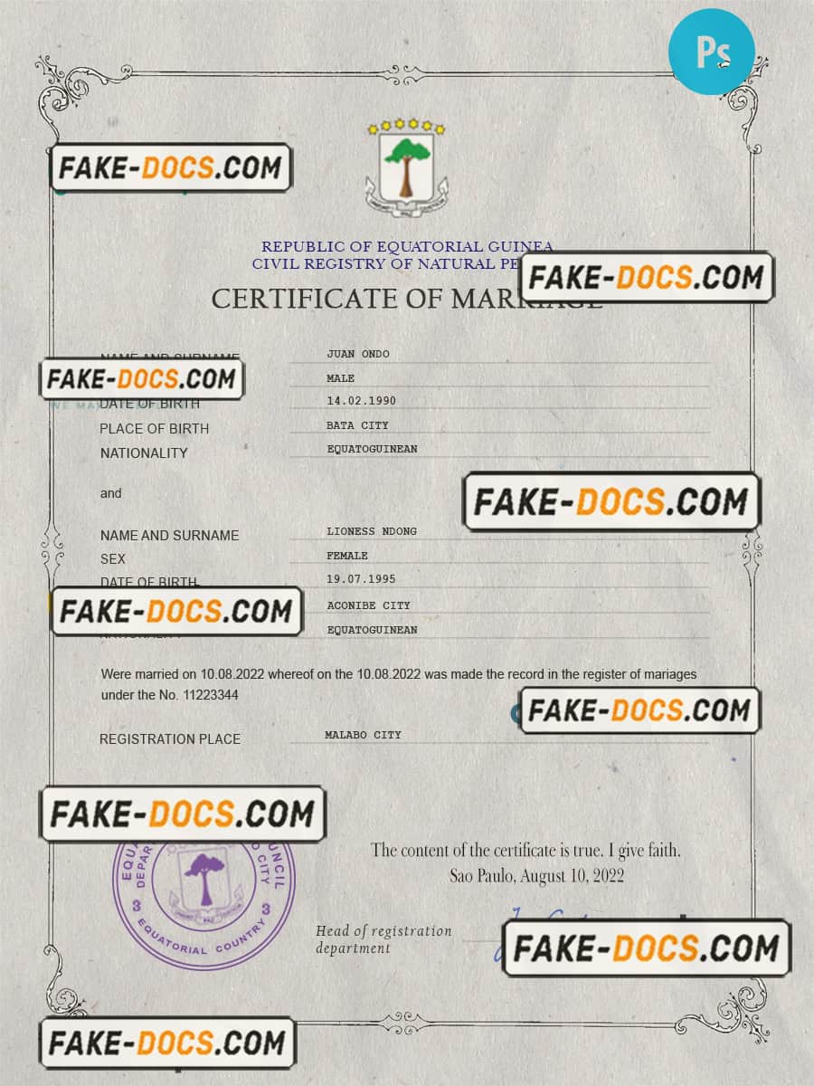 Equatorial Guinea marriage certificate PSD template, fully editable