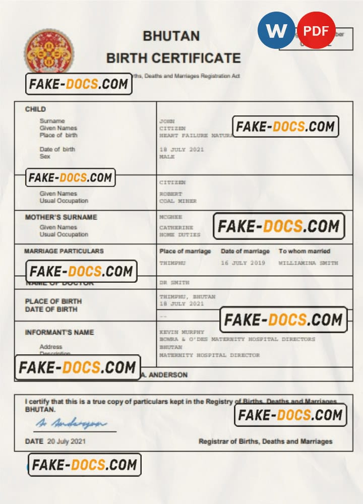Bhutan vital record birth certificate Word and PDF template, completely editable